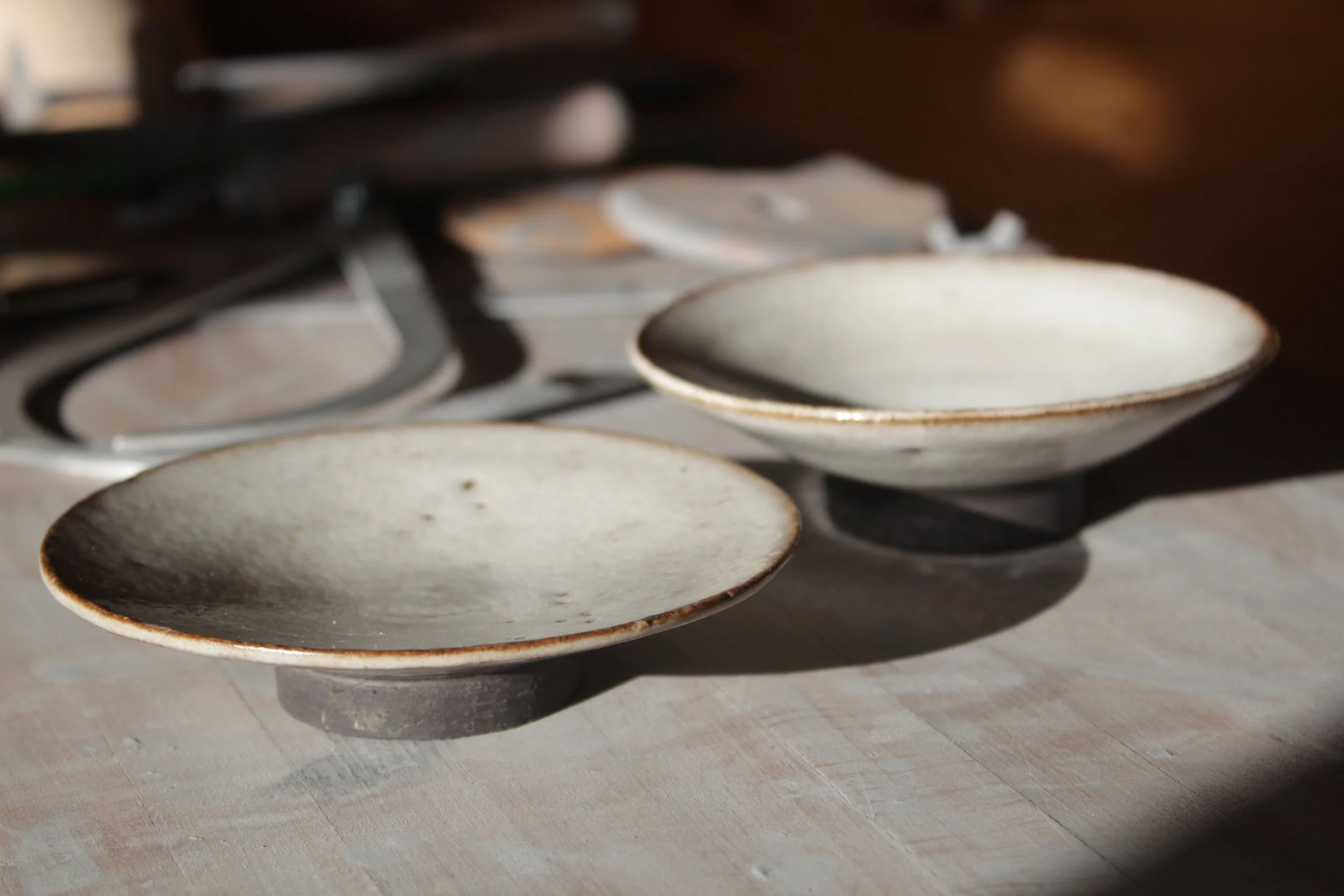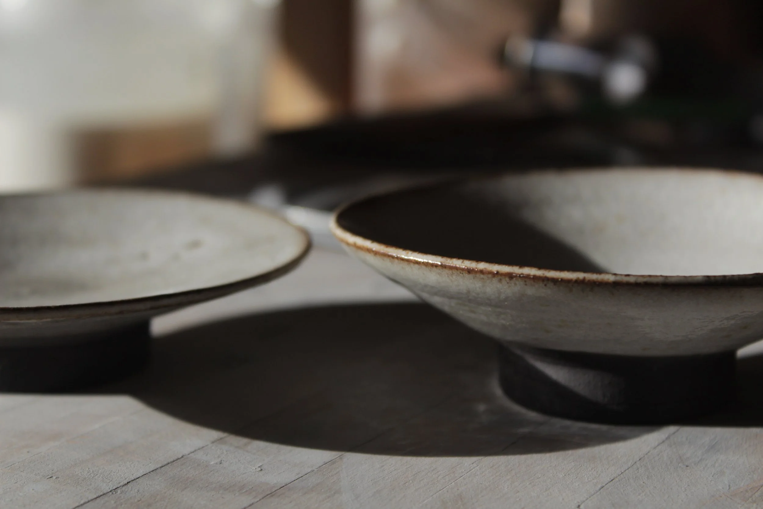 This body of work was comprised of 140 individual tableware items, mainly small saucers, small bowls, side-plates, shallow bowls and ramen bowls for Arras restaurant. They were all wheel thrown using a dark burning black stoneware and fired with a reactive tin white glaze to Cone Δ6 / 1240°C.