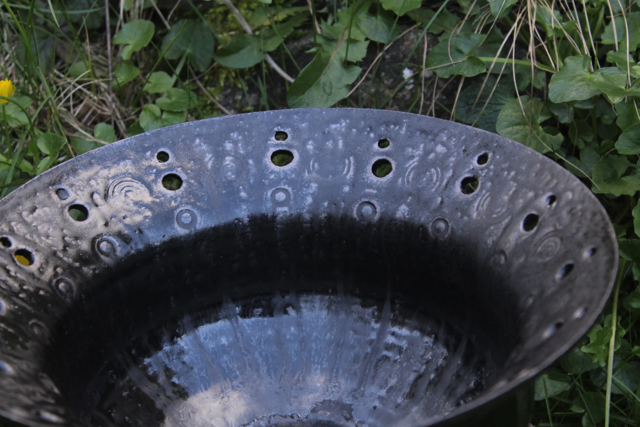 This open formed pot was made using a black stoneware and an ash glaze comprised of the ashes of various plants and trees. It is an unwashed ash glaze to allow for the alkalinity of ash to have a fluxing effect on the glaze. This piece was fired to 1260°C in an oxidative atmosphere.